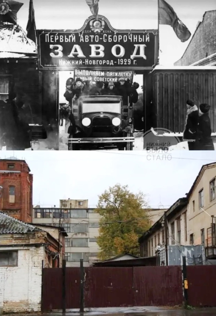 На второй фотографии вверху момент выезда за ворота первого, собранного в Нижнем Новгороде, автомобиля "Форд". Это 1930 год, ещё не город Горький и ещё не Автозавод. Это небольшой заводик, где по договорённости с американцами небольшой отрезок времени собирали "Форды". Как сейчас говорят "отвёрточная сборка".